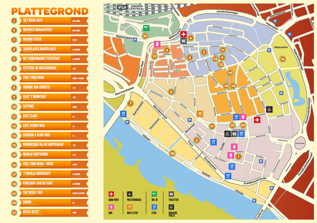 Bekijk hier de officiële plattegrond van Koningsdag Arnhem met alle podia, toiletten, barpunten, EHBO-posten en andere belangrijke locaties, zodat je goed voorbereid op pad gaat!